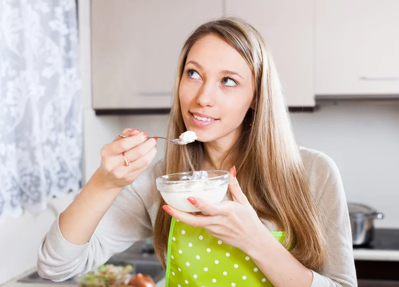 Девушка ест творог Источник фото: freepik
