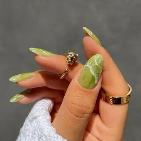 Хризолит – один из полудрагоценных камней августа. И этот вариант с основой из его деликатного цвета и мраморными прожилками отлично смотрится. Начните с прозрачной основы цвета матча, затем специальной кисточкой добавьте белые завитки и акценты из золотой фольги сверху.