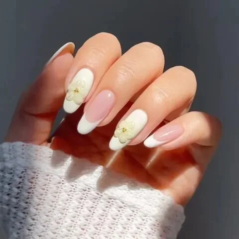 Когда-то август был последним месяцем, когда можно было носить белое, не выглядя при этом нелепо. Сегодня это считается общепринятым модным правилом, которое можно преобразовать в кремовых оттенках зефира и льна. Поэтому смело добавляйте 3D-цветочный дизайн к белому или нюдовому маникюру, чтобы придать ему дополнительный сезонный оттенок.